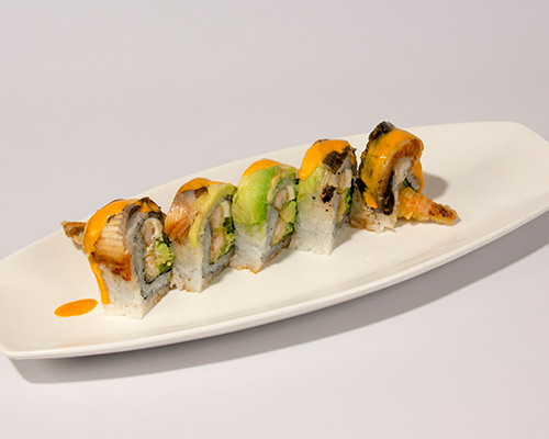 Shrimp tempura, cream cheese, cucumber topped with eel, avocado, sweet sauce and spicy mayo